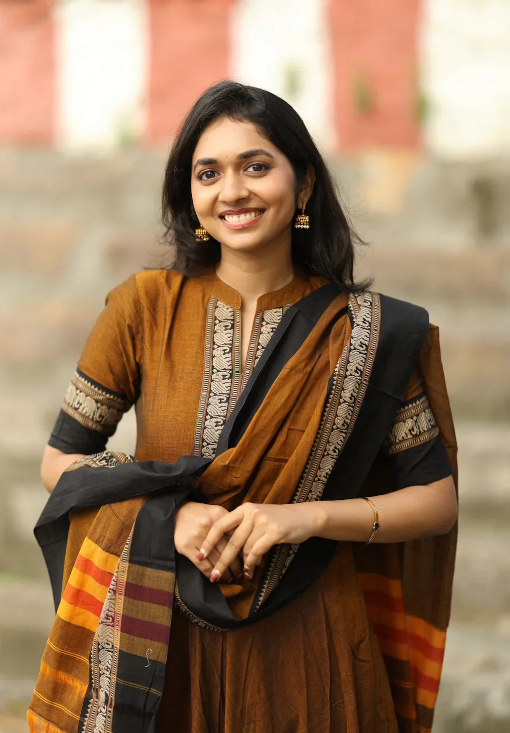 Elephant design woven reference handloom Anarkali kurti with a striking temple big border and attached cotton lining