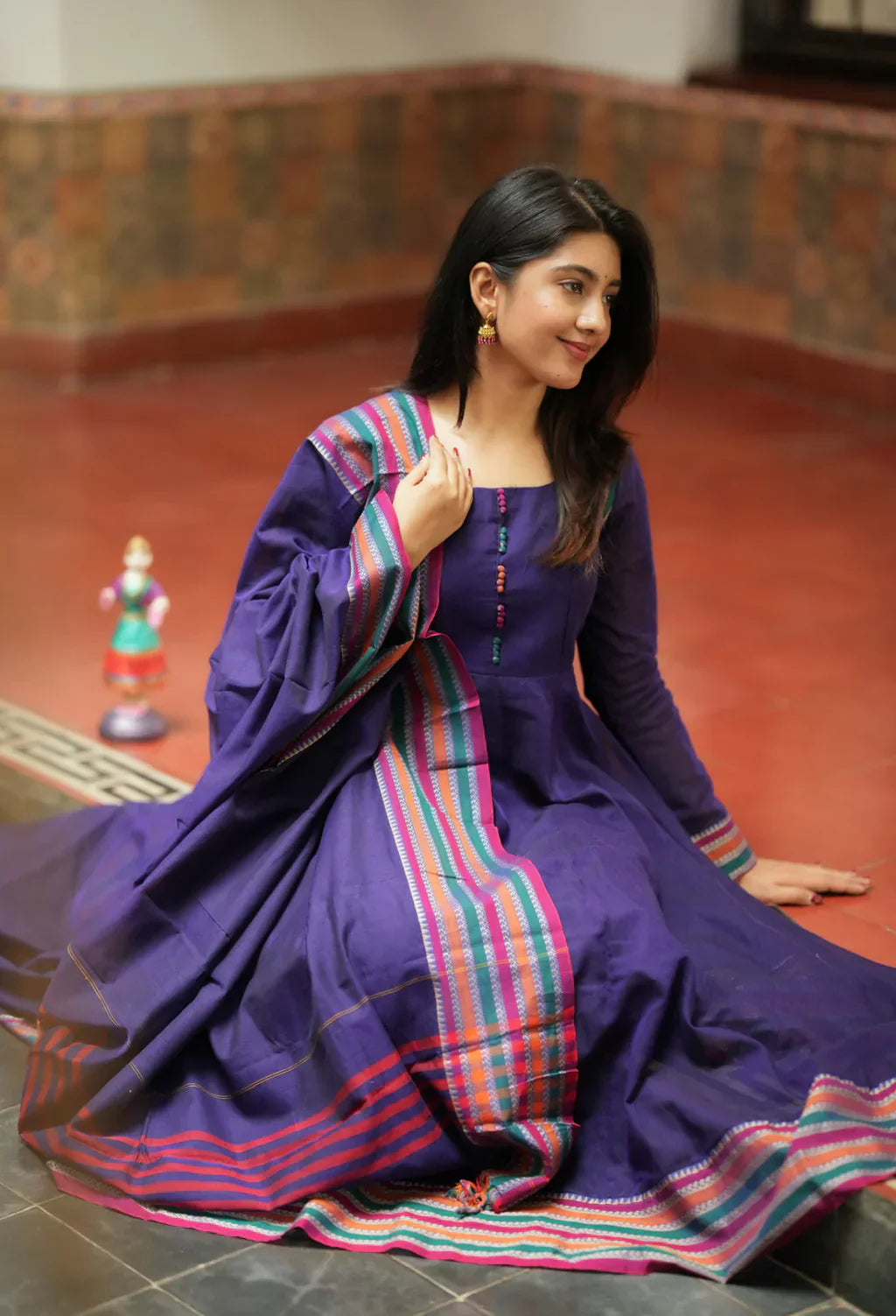 Multi color border design woven reference handloom Anarkali kurti with a striking temple big border and attached cotton lining