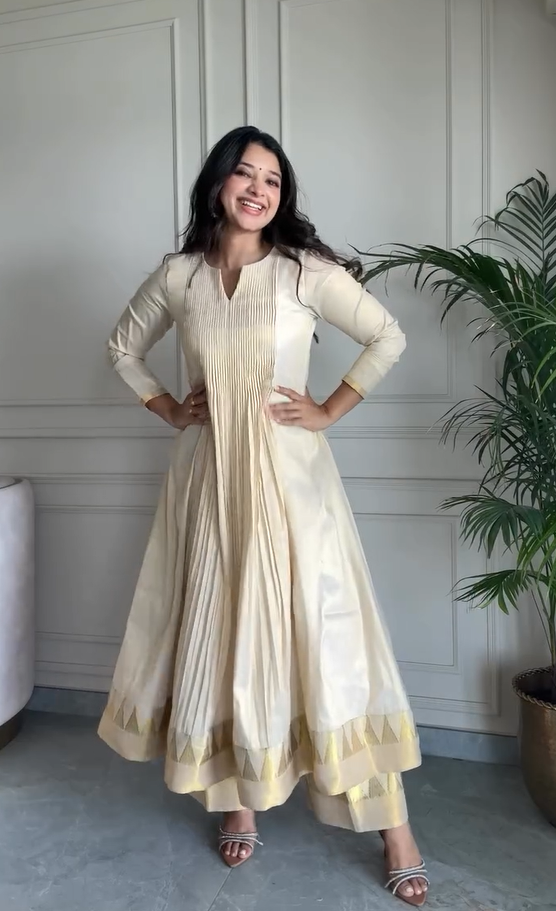 A timeless silhouette meets subtle craftsmanship in this off-white panelled Anarkali, crafted in soft textured sheer sucker. The fit-and-flare structure flows gracefully. this piece features delicate hand embroidery tracing the bust seams and panel lines, carried through to the back for a thoughtfully finished look. The silhouette twirls effortlessly, making it perfect for festive gatherings and serene daytime moments.